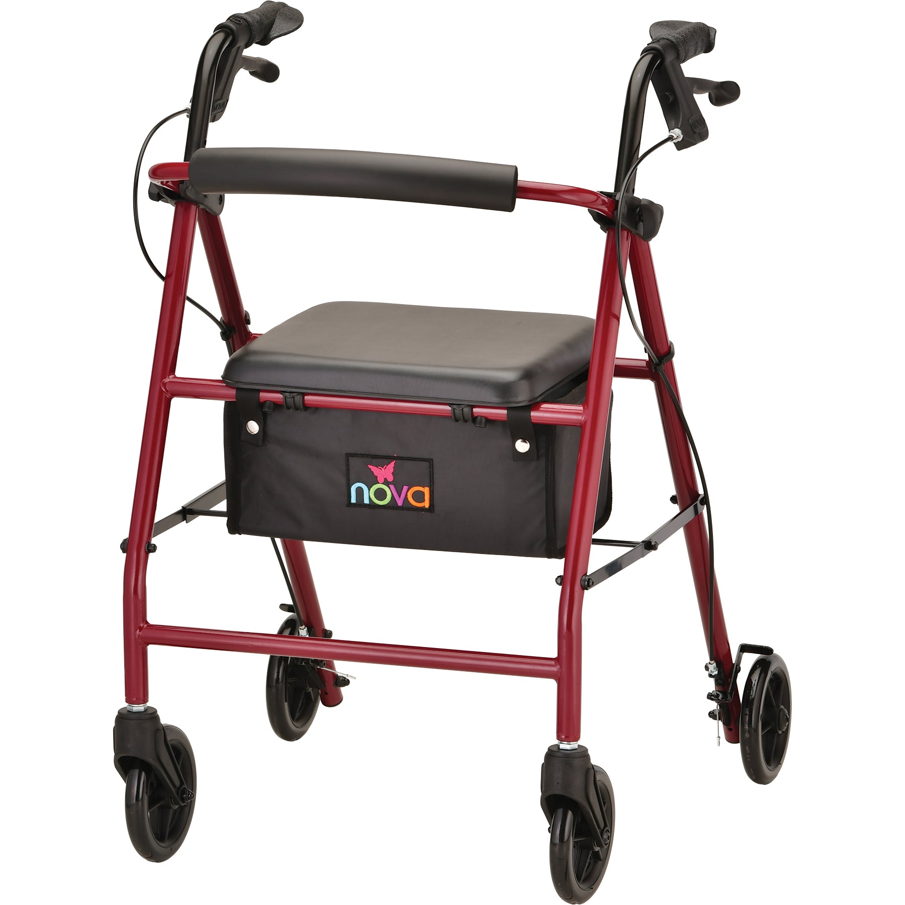 - WHEELS & BRAKES: Equipped with 6′ rubber wheels with 1′ wide base, NOVA’s wheels are durable, great for indoor and outdoor use and make the ride smooth and stable. NOVA’s patented feather touch hand brakes are uniquely designed for maximum comfort and control. It is easy to engage the brake with a small grip and minimal hand strength. Parking or locking the brakes takes just a gentle push downward on the lever and a pull upwards to release. Our brakes are backed by the best Brake Warranty with a 5 year warranty on all brake parts
